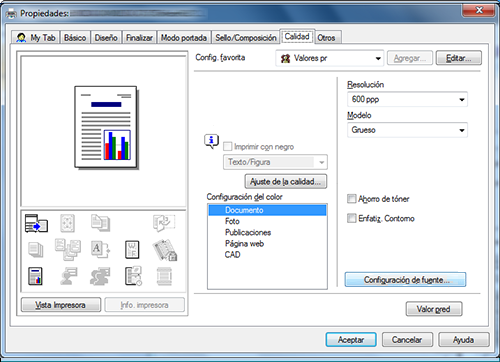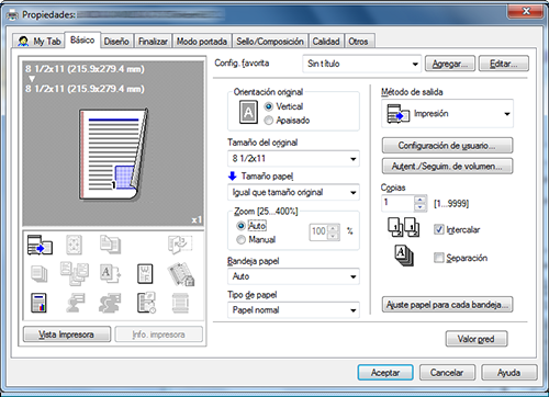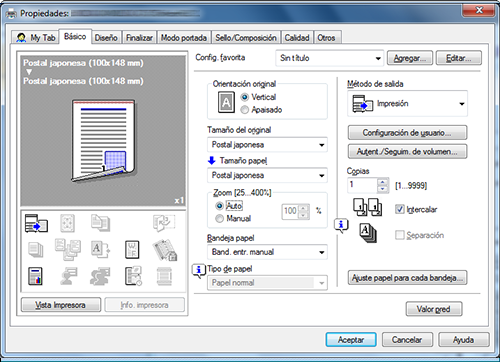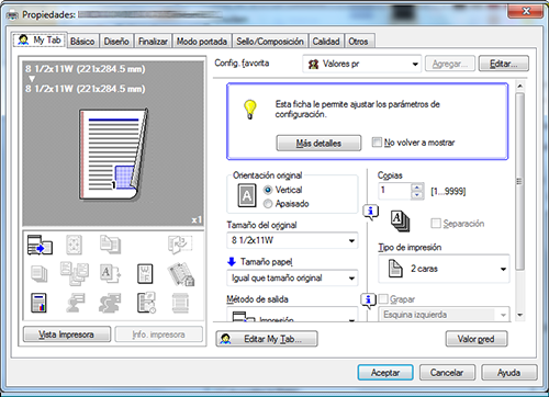 A15. Sí. Es posible personalizar de forma sencilla la ventana desde la ventana Propiedades del controlador de impresora registrando funciones utilizadas con frecuencia en masa en My Tab o registrando los ajustes para las correspondientes fichas como favoritos para una activación rápida.