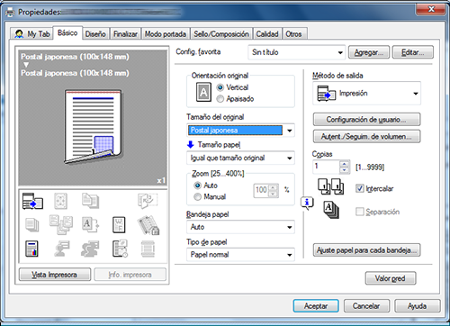 En [Tamaño del original] en la ficha [Básico], seleccione [Sobre] o [Tarjeta postal].