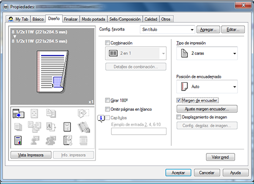 Para imprimir más de una página original en el mismo lado de una única hoja, seleccione la casilla de verificación [Combinación] en la ficha [Diseño] para seleccionar un formato de combinación de páginas. Para imprimir en ambas caras del papel, seleccione [2 caras] en [Tipo de impresión] en la ficha [Diseño].