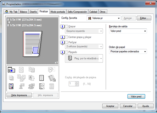 Seleccione la casilla de verificación del acabado deseado en la ficha [Finalizar]. Si ha seleccionado las casillas de verificación [Grapar], [Perforar] o [Plegado], especifique la cantidad, posición y otros ajustes necesarios.