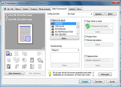 En la ficha [Sello/Composición], seleccione la casilla de verificación [Marca de agua] y, a continuación, seleccione una marca de agua.