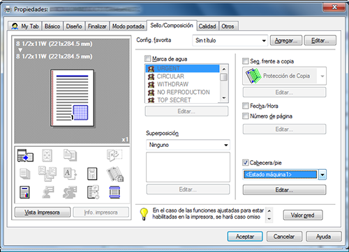 En la ficha [Sello/Composición], seleccione la casilla de verificación [Cabecera/pie] y, continuación, seleccione la información que se va a imprimir.