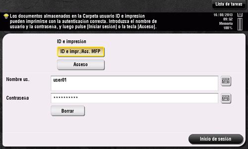 Seleccione [ID e impr./Acc. MFP], introduzca su nombre de usuario y contraseña y, a continuación, toque [Inicio de sesión].
