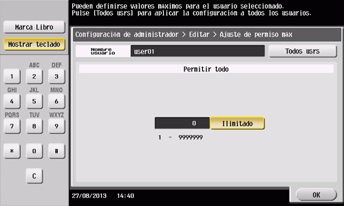 Toque [Ajuste permiso máx] e introduzca el número máximo permitido de originales que el usuario puede imprimir con el teclado.