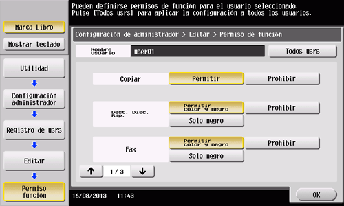 Toque [Permiso de función] para configurar el límite de las funciones correspondientes.