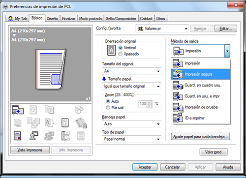 En [Método de salida] en la ficha [Básico], seleccione [Impresión segura].