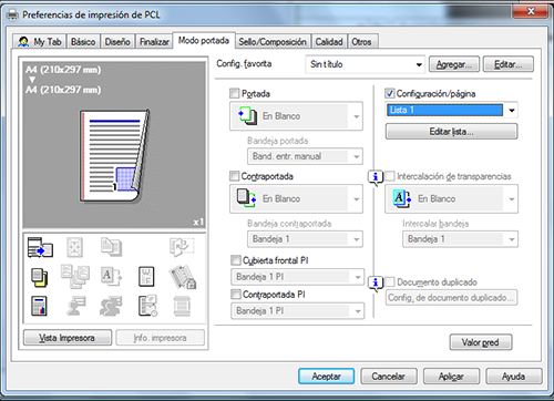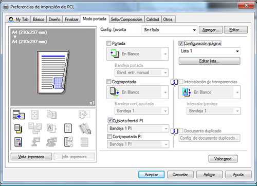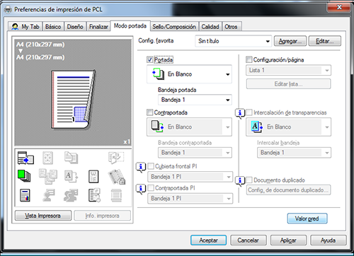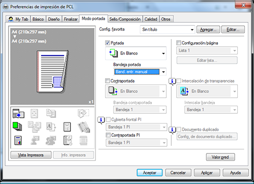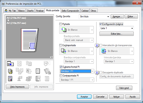Seleccione [En Blanco] o [Imprimir] en [Portada] y una bandeja de papel en [Bandeja portada].