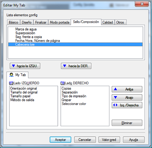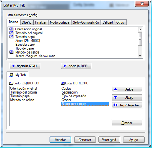 Para registrar funciones en My Tab, seleccione las funciones que desea registrar en [Lista elementos config] y haga clic en [hacia la IZQU.] o [hacia la DER.].