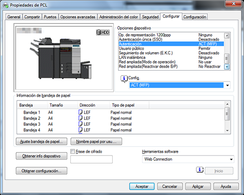 En [Opciones dispositivo] en la ficha [Configurar], seleccione [Autenticación] y, a continuación, seleccione el estado de autenticación en [Config.].