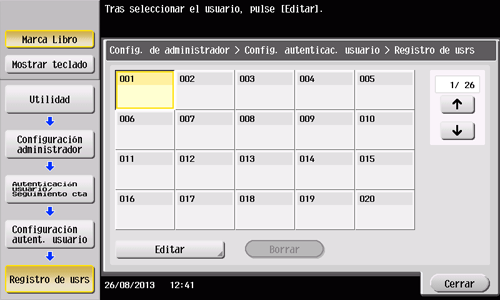 Seleccione [Configuración autent. usuario] - [Registro de usrs].