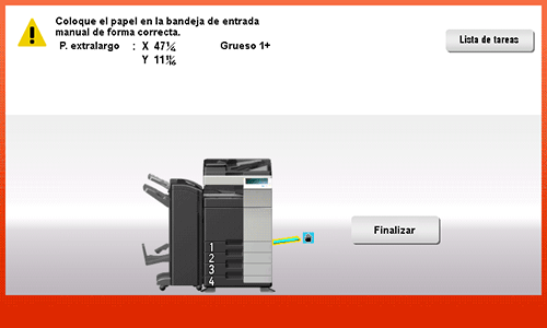 Si no puede tocar [Finalizar], retire los sobres o postales cargados en la bandeja manual y vuelva a cargarlos; a continuación, toque sobre [Finalizar].