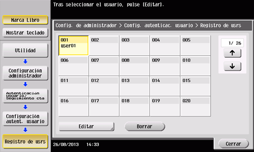 Seleccione [Autenticación usuario/Seguimiento cta.] - [Config. de autenticac. de usuario] - [Registro de usrs].