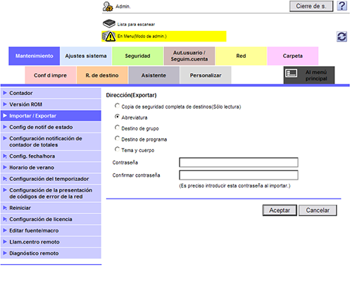 • Una vez realizada la exportación con introducción de contraseña, la importación de los destinos a otra MFP requiere la introducción de contraseña.