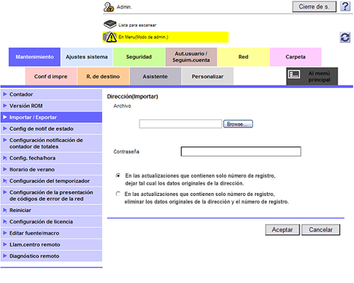 • Al importar [Dirección], si selecciona [En las actualizaciones que contienen solo número de registro, dejar tal cual los datos originales de la dirección.], la información de dirección, incluida en un archivo que se va a importar, que contenga solamente un número de registro, no se registra en la máquina. Si selecciona [En las actualizaciones que contienen solo número de registro, eliminar los datos originales de la dirección y el número de registro. ], la información de dirección que contenga solamente un número de registro se elimina de la máquina.