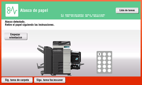 [Empezar orientación] | Toque este botón para iniciar las instrucciones animadas que muestran cómo se elimina el atasco de papel/grapas. |