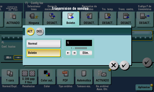 [Boletín] | Seleccione esta opción para registrar un archivo para sondeo en la carpeta de usuario de boletín. Introduzca el número de registro de la carpeta de usuario de boletín que desea crear con el teclado. Para mostrar el teclado, toque el área de entrada numérica. La carpeta de usuario de boletín solo puede contener un archivo. Puede crear hasta 10 carpetas de usuario de boletín. Pueden utilizarse según el uso previsto. |