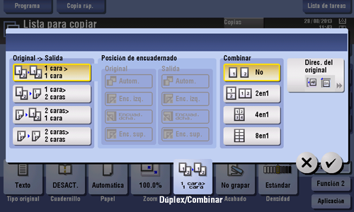[Original > Salida] | Seleccione una combinación del original que va a cargarse (original de 1 cara u original de 2 caras) y el método de copia (copia de 1 cara o copia de 2 caras). Para obtener más información, consulte Aquí. |