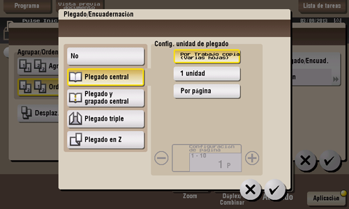 Se obtiene una hoja impresa plegada en dos. Seleccione también la Unidad mediante la cual se pliega el papel en [Por Trabajo copia (Varias hojas)], [1 unidad] y [Por página]. Al configurar [Por página], especifique el número de páginas que deben plegarse al mismo tiempo.
