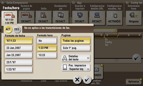 Es posible seleccionar una posición y formato de impresión, y añadir la fecha y hora. La fecha y hora pueden imprimirse en todas las páginas o únicamente en la primera.