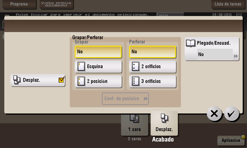 Si se ha instalado una unidad de acabado o el separador de trabajos JS-506, las hojas impresas se expulsan y apilan una encima de otra, con cada juego de copias o páginas escalonado para separarlas.