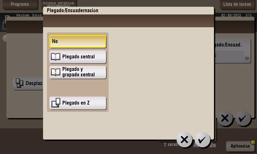 [Plegado central] | Se obtiene una hoja impresa plegada en dos. Para obtener más información, consulte Aquí. |
