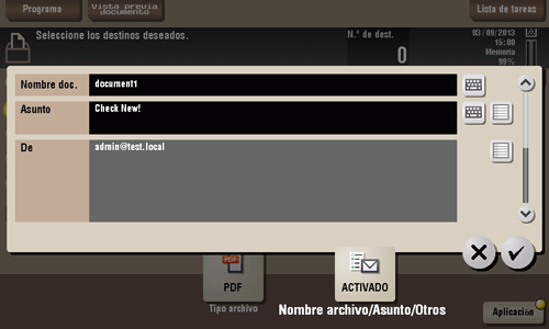 Al enviar por correo electrónico, puede especificar el texto del asunto y del mensaje de un correo electrónico y modificar la dirección de correo electrónico del remitente (dirección "De").