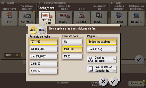 Es posible seleccionar una posición y formato de impresión, y añadir la fecha y hora. La fecha y hora pueden imprimirse en todas las páginas o únicamente en la primera.