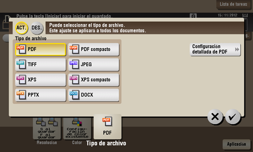 [Configuración detallada de PDF] | Si selecciona el formato de archivo [PDF] o [PDF compacto], puede configurar las opciones de PDF. Se puede optimizar la seguridad adjuntando una firma digital que identifique al autor del documento, mediante cifrado de archivos, etc. Para obtener más información, consulte Aquí. |