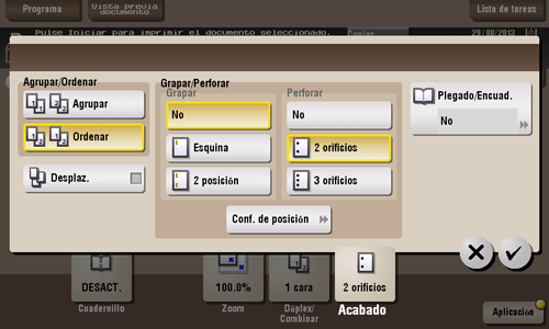 [Conf. de posición] | Seleccione una posición para perforar. Si la posición de perforación se ha ajustado a [Auto], la posición para perforar se determina de forma automática en función de la dirección del archivo de impresión. |