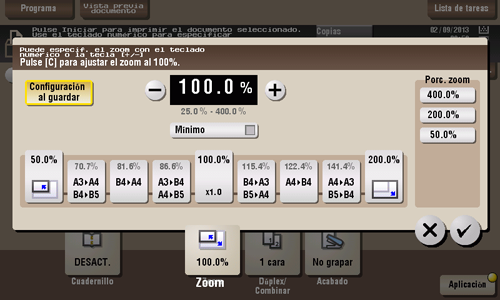 [+]/[-] | Introduzca manualmente un porcentaje de escala. También es posible introducir el porcentaje de escala desde el teclado. Para mostrar el teclado, toque el área de entrada numérica. |