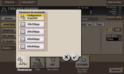 [Resolución escáner.] | Seleccione la resolución que se debe utilizar para escanear y enviar el original. Para utilizar las funciones Transmisión de e-mail, Transmisión SMB, Transmisión FTP o Transmisión WebDAV, se selecciona la siguiente resolución para el envío.