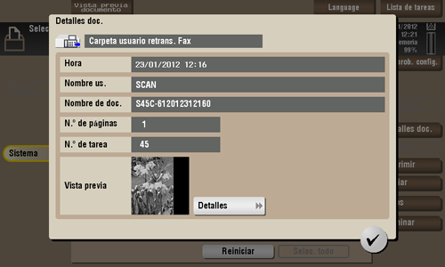 Es posible consultar la hora de almacenamiento y el recuento de páginas, así como previsualizar la imagen del archivo seleccionado.