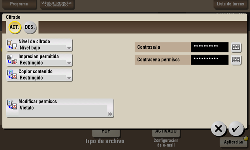 Si el tipo de archivo se ha ajustado a [PDF] o [PDF compacto], es posible cifrar los archivos PDF.