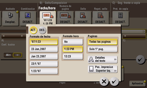 Es posible seleccionar una posición y formato de impresión, y añadir la fecha y hora. La fecha y hora pueden imprimirse en todas las páginas o únicamente en la primera.