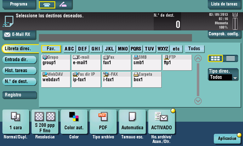 Seleccione un destino registrado en esta máquina. Si selecciona varios destinos, puede enviar datos por transmisión de difusión.