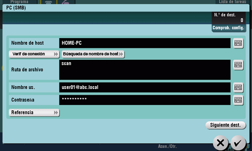 [Referencia] | En el panel táctil, busque el ordenador al que desea enviar un archivo y seleccione una carpeta compartida de destino. Cuando aparezca la pantalla de autenticación, introduzca el nombre y la contraseña de un usuario que tenga privilegios de acceso a la carpeta seleccionada. Después de la autenticación, se introduce automáticamente el [Nombre de host] o la [Ruta de archivo]. La función Referencia puede fallar en las siguientes condiciones.