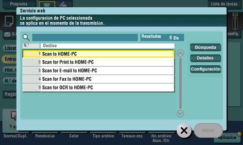 Si resulta difícil encontrar un destino porque hay demasiados destinos, toque [Búsqueda]. Seleccione un destino y toque [Detalles] para comprobar la información de destino. Para seleccionar una configuración de opciones, toque [Configuración].