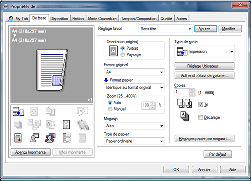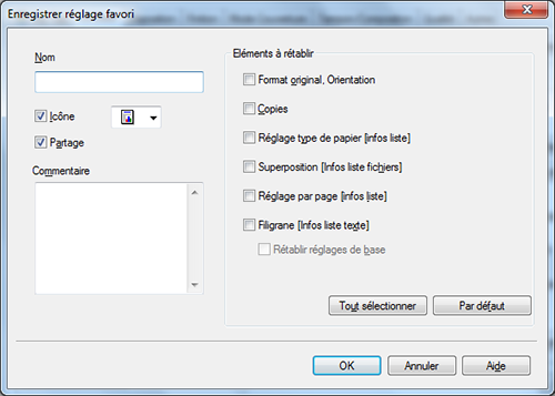 Les réglages d'impression sont enregistrés comme favori. Avant d'imprimer, vous pouvez sélectionner le réglage enregistré dans [Réglage favori].