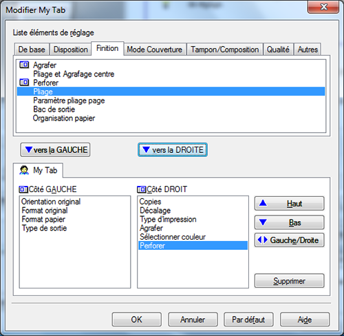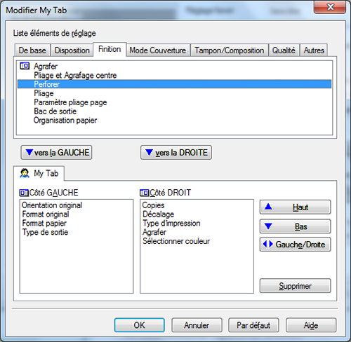 • Cliquez sur [vers la GAUCHE] placer la fonction sélectionnée sur le côté gauche de My Tab [My Tab] et cliquer sur [vers la DROITE] la place sur le côté droit de [My Tab].