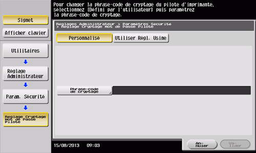 Tapez sur [Utilitaire] - [Réglages Administrateur] - [Param. Sécurité] - [Réglage Cryptage Mot de Passe Pilote].