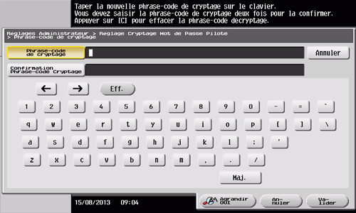 Tapez sur [Phrase-code de cryptage] et entrez la nouvelle phrase-code de cryptage (20 caractères alphanumériques max., symboles compris).