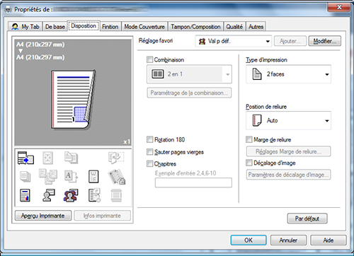 Dans l'onglet [Disposition], vous pouvez configurer les réglages d'orientation pour l'impression. Vous pouvez combiner les pages ou ajuster les positions d'impression.
