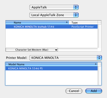 Sélectionnez [AppleTalk] pour la méthode de connexion et sélectionnez ensuite la zone à laquelle la machine est connectée.