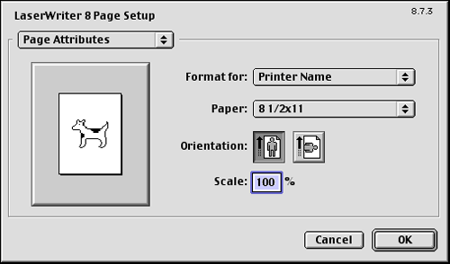 Dans [Page Attributes] dans la fenêtre [Page Setup] (ou [Paper Setup]), vous pouvez configurer les réglages papier élémentaires.