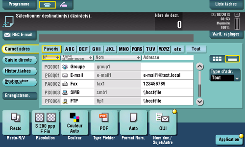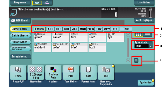 Dans [Histor. tâches], sélectionnez une destination dans l'historique des destinations d'émissions de données numérisées ou de destinations enregistrées.