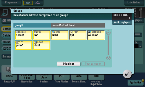 Lorsqu'un groupe est sélectionné dans [Carnet adres], sélectionnez la destination à laquelle vous souhaitez envoyer des données parmi les destinations enregistrées dans le groupe. S'il y a dans les destinations enregistrées dans le groupe une destination qui n'est pas souhaitée pour l'envoi des données, tapez [Tout sélection], puis tapez sur la destination pour la désélectionner.