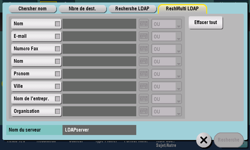 Il existe deux moyens d'effectuer une recherche : utilisez [Recherche LDAP] en recherchant un numéro de fax avec un seul mot-clé et utilisez [RechMulti LDAP] en recherchant un numéro de fax en combinant des mots-clés de différentes catégories.