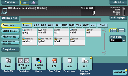 Au besoin, vous pouvez modifier l'affichage de l'écran principal du mode fax/numérisation (par défaut : [Carnet adres]). Pour des détails, voir ici.