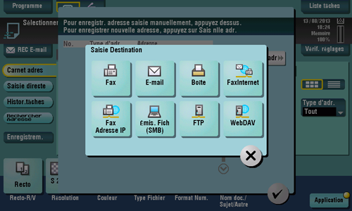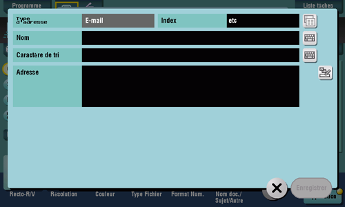 Il est possible d'enregistrer jusqu'à 2000 adresses. Les types de destination susceptibles d'être enregistrés sont l'adresse e-mail, le nom de l'ordinateur, etc. en fonction du mode d'émission.