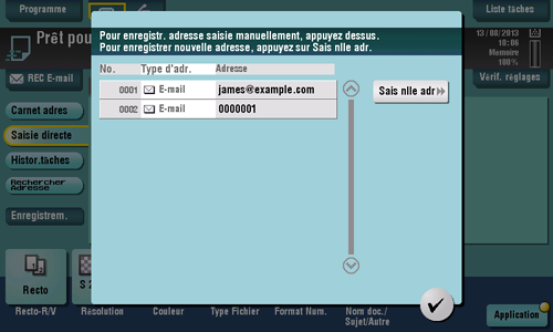 Tapez sur [Sais nlle adr] pour enregistrer la nouvelle adresse qui n'est pas encore saisie. Pour des détails sur comment enregistrer, voir ici.